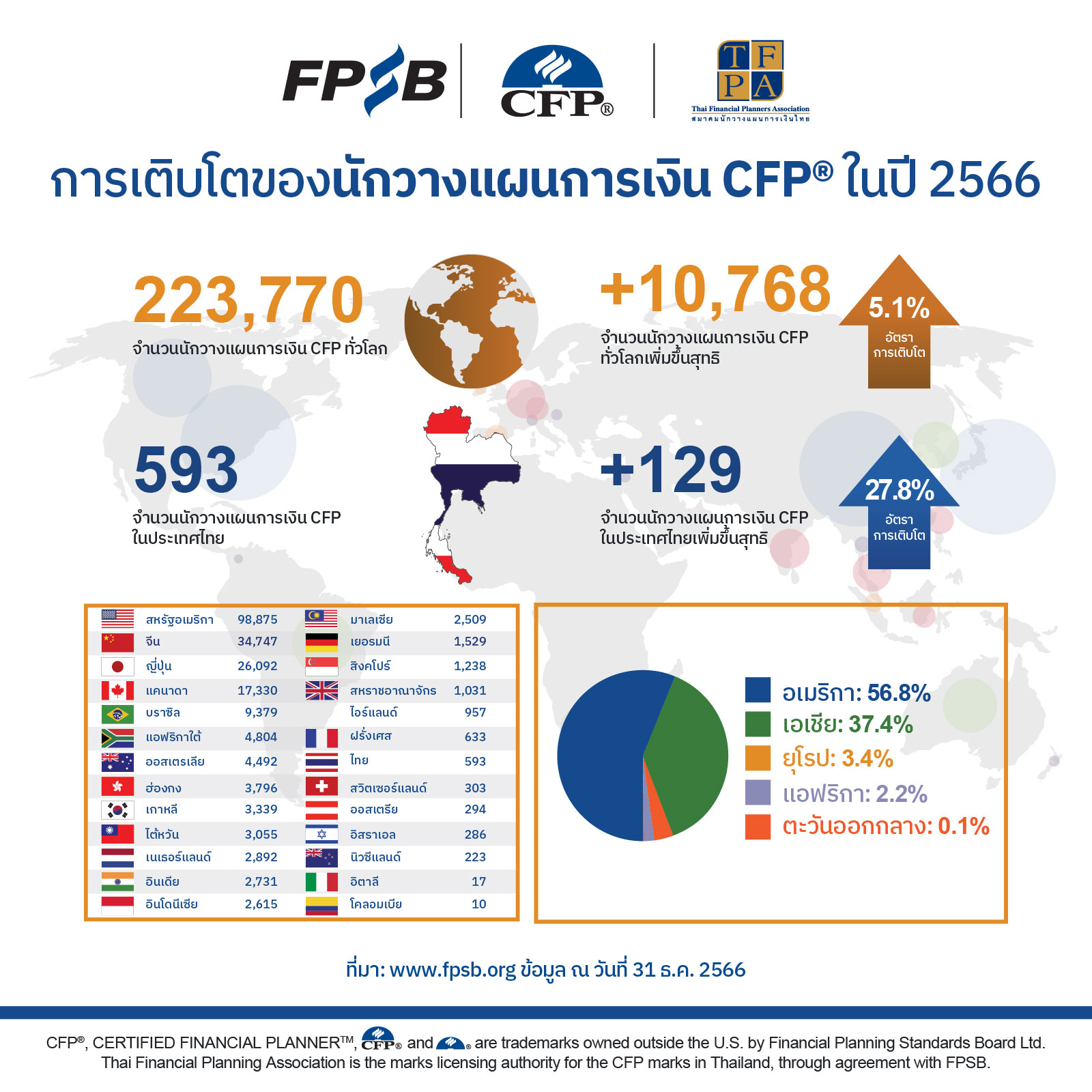 ในปี 2566 นักวางแผนการเงิน CFP ทั่วโลกเติบโตร้อยละ 5.1 มีจำนวนทั้งสิ้น 223,700 คน เพิ่มขึ้นสุทธิ 10,768 คน โดยทวีปอเมริกาและภูมิภาคเอเชีย-แปซิฟิกมีนักวางแผนการเงิน CFP เพิ่มขึ้นสูงสุดในปีที่ผ่านมา ในส่วนของประเทศไทย มีนักวางแผนการเงิน CFP รวมทั้งสิ้น 593 คน เพิ่มขึ้นสุทธิ 129 คน เติบโตร้อยละ 27.8 เมื่อเทียบกับในปี 2565